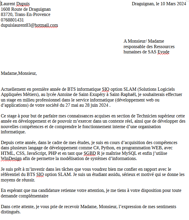 Par la suite, j'ai donc contacté une entreprise, EVODE. Il m'a donc fallut une lettre de motivation, ci-dessous :